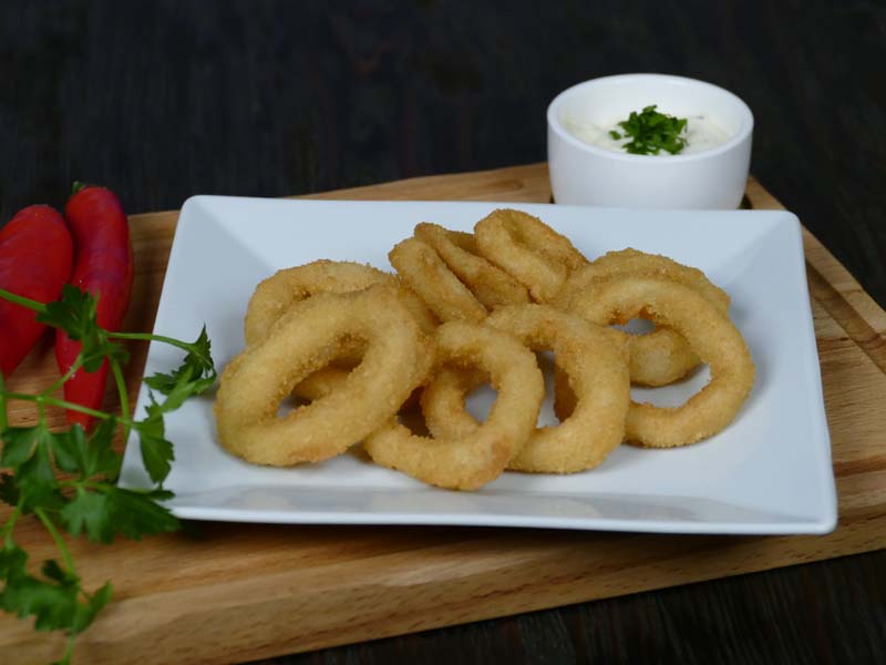 Кольца из филе кальмара, луковые кольца, соус Болье