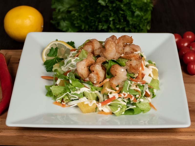 Свеже обжареные тигровые креветки подаем на подушке из свежих овощей и салатов: Перец болгарский, салат листовой, огурец свежий, томат свежий, лук красный, и слегка приправляем гранатовым соусом Наршираб.