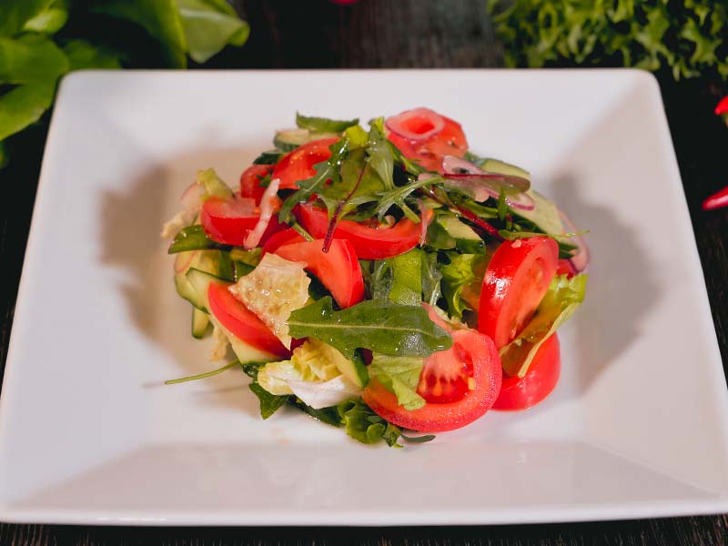 Огурец свежий, айзербайджанский томат, лук- репка красный, салат зеленый